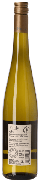 Niederberg-Helden GG „In der Bärlay“ 2024 är en exklusiv mikroproduktion framställd på 100 % Riesling som Axel Pauly handskördar från den särskilt branta och steniga Bärlay-parcellen på Grand Cru-topvinmarken Lieserer Niederberg-Helden (klassificerad som Grosses Gewächs). Denna upp till 70 % branta och sydvända sluttning har en jordmån av blå och grå skiffer. Vinet kallmacererar först i hela 30–40 timmar innan spontan jäsning på ståltank med vingårdens naturligt förekommande jäststammar. För att uppnå extra komplexitet och struktur i sin Riesling 'Grand Cru' inkluderar Axel Pauly 5 % druvskal i musten under jäsningen. Vinet jäser och mognar på ståltank för en ren och autentisk återgivning av druvsort och terroir.