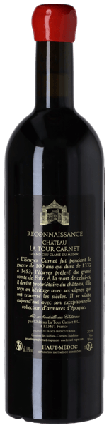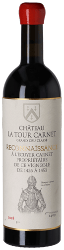 Reconnaissance är skapad av de finaste druvklasarna från La Tour Carnets bästa Cabernet Sauvignon-parcel (75 %) samt de bästa Merlot-druvorna de har tillgång till (18 %). Fulländad med 7 % perfekt mogen Cabernet Franc. Krämen av krämerna.