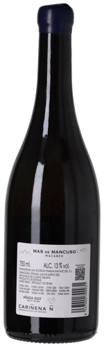 Mas de Mancuso är Jorges personliga projekt, där han återupplivat flera gamla vingårdar och vinstockar för att frigöra deras enorma potential. Till denna toppvin handskördas noggrant utvalda Macabeo-druvor från 60 år gamla vinstockar belägna på 800 meters höjd vid Almonacid de la Sierra i Cariñena-appellationen, sydväst om Zaragoza. Här växer plantorna i skifferhaltig jord och vetter mot norr, vilket ger små, koncentrerade druvor med friskhet och mineralitet. Faktum är att varje vinstock bara ger 1,5 kg druvor.