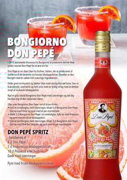 Don Pepé är en utsökt likör från Sicilien, Italien, som framställs av skalen från de berömda sicilienska blodapelsinerna. Den har sedan berikats med en rad helt naturliga ingredienser. Resultatet är en mystisk och läcker likör med en mycket vacker röd färg. Den är brännande, aromatisk och helt unik, med en fyllig smak och en delikat ton av siciliensk blodapelsin.