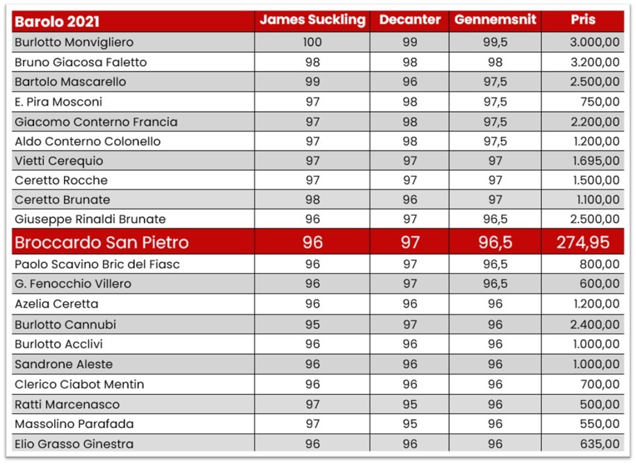 Titta bara på listan över 2021 års bäst bedömda Barolo-viner – rankade efter deras högsta snitt hos James Suckling och Decanter. Alla på listan kostar mellan 500 och 3 000 DKK per flaska – med ett viktigt undantag...