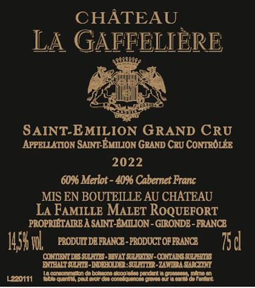 "The 2022 La Gaffelière is a drop-dead gorgeous beauty. Refined, sculpted and wonderfully precise, La Gaffelière simply has it all. Hints of lavender, mint, blood orange, spice and black cherry fruit all race across the glass. Clean mineral notes and fine tannins support the finish. The delineation here is simply breathtaking. La Gaffelière is 60% Merlot and 40% Cabernet Franc. Élevage is expected to be 19 months in 50% new oak and 50% neutral barrels. The 2022 is another exceptional wine from the Malet Roquefort family. Drinking window : 2032-2062" - Antonio Galloni