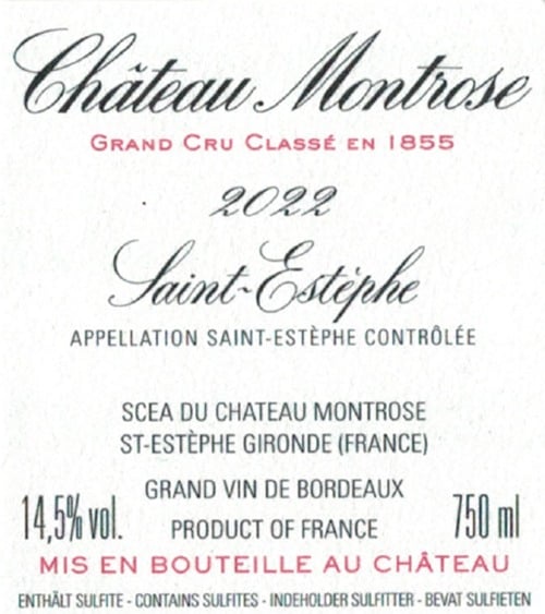 The 2022 Montrose is composed of 66% Cabernet Sauvignon, 25% Merlot, 8% Cabernet Franc, and 1% Petit Verdot, aging in 60% new oak. Deep garnet-purple in color, it slowly unfurls to offer a gorgeous perfume of violets, star anise, wilted roses, cumin seed, and garrigue, giving way to a core of blackcurrant pastilles, boysenberry preserves, and kirsch. The full-bodied palate is a firework display of graceful, highly nuanced fruit, featuring mineral, floral, black fruit, and red berry sparks, supported by very firm, super-ripe tannins and incredible freshness, finishing very long, vibrant, and shimmery. The yield was 31 hl/ha and the First Wine represents 50% of the 2022 production. The quality of the press wine was high this year, and 13% was included in the blend. pH 3.78, TPI 85.