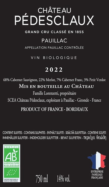 “A blend of 68% Cabernet Sauvignon, 22% Merlot, 7% Cabernet Franc, and 3% Petit Verdot, aging in 65% new oak, the 2022 Pedesclaux has a pH of 3.86 and a TPI of 70. The yield was 37 hl/ha and this is the first year that it has been certified organic. The color is deep garnet-purple and the nose needs a fair bit of swirling to coax out evocative notes of blackcurrant cordial, juicy black plums, and black raspberries, with touches of violets, licorice, and wood smoke. The full-bodied palate is concentrated, yet possesses impressive tension and a firm backbone of ripe, grainy tannins, finishing long and layered.”