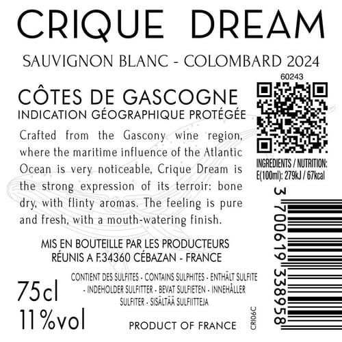 Crique Dream 2024 är tillverkat av 50% Sauvignon Blanc, som kompletteras med samma mängd Colombard. Druvorna väljs från kalkhaltiga jordar nära Atlanten, där ett svalt maritimt inflytande ger druvor och vin som är fyllda med smakrik mineralitet och skarp aromatisk rikedom.