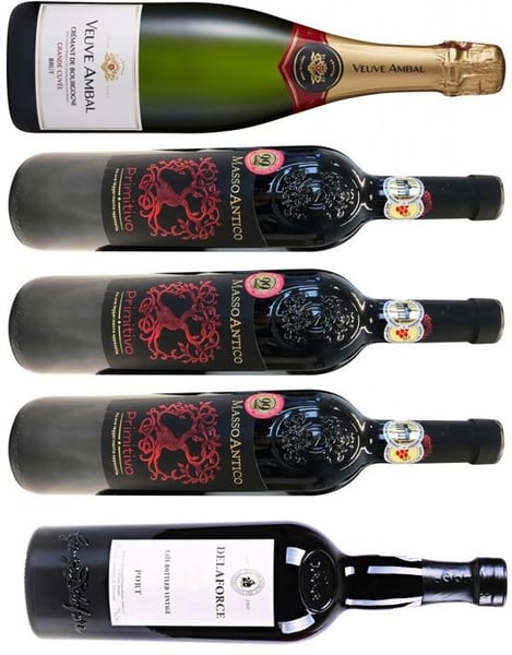 Du får en topanmeldt Crémant de Bourgogne, hele tre flasker af den højest scorende Masso Antico Primitivo årgang, samt en skamrost Delaforce portvin og en strawberry gin med dertilhørende luksustonic.