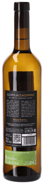 Gorka Izagirre tillhör den baskiska appellationen D.O. Bizkaiko Txakolina, som etablerades redan 1994 och omfattar omkring 250 hektar vingårdar med endast 69 registrerade producenter. Gorka Izagirre är med sina 42 hektar klart ledande och mest framgångsrik i området. Huvudrollerna intas av de tre sällsynta druvsorterna Hondarrabi Zuri, Hondarrabi Zerratia och Hondarrabi Beltza (röd), som tas om hand i källaren av vinmakaren José Ramon Calvo.