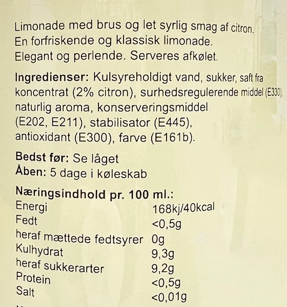 Lemonad med kolsyra och lätt syrlig citronsmak.
