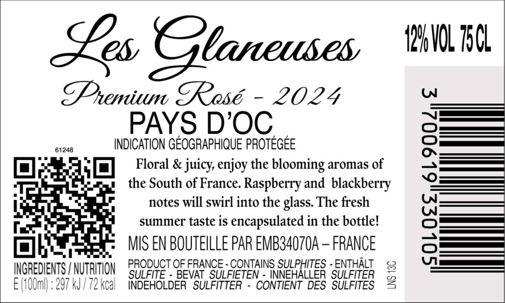 Les Glaneuses är gjort på 100% av den klassiska rosédruvan Cinsault i daggvåta 2024. Alla druvor plockas från kustnära fält nära den franska Medelhavskusten. Cinsault är rosé-druvan över dem alla - känd för sina lätta, friska och aromatiska viner. Svala, fuktiga vindar från Pyrenéerna ger druvor som är fyllda med friskhet och finess. Druvorna skördas under de svala kvälls- och natttimmarna, så att de behåller all sin ungdomliga fräschör på vägen till vingården. Musten jäser svalt för att bevara de flyktiga fruktsmakerna, medan tre månaders mognad på jästfällningen ger vinet en härligt mjuk konsistens.