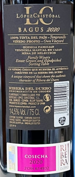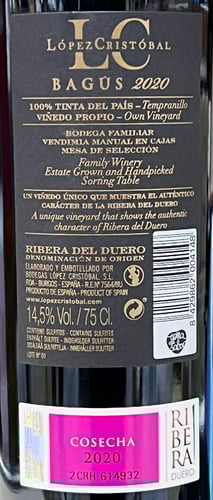 Lopez Cristobal Bagús 2020 är gjord av 100% Tempranilllo. Druvorna handplockas från 85 år gamla vinstockar som växer på 850 meters höjd på den kalkrika Pago de Manvirgo.
