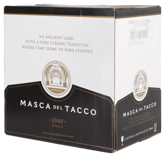 Masca del Tacco Susumaniello Puglia 2024 glittrar, fyllig och mörklila i glaset med en nästan svart kärna... Ur glaset stiger en klassisk syditaliensk charmdoft av oemotståndligt saftiga plommon, blåbär och solmogna björnbär, samtidigt som man anar söta fatkryddor, sviskon, lakrits och en härlig russinsötma under den imponerande frukten... Nejlika, kanel, muskotnöt och kakao, ett helt kryddskåp, träder fram och kompletterar den täta, flerskiktade kraftfrukten. Susumaniello framstår sammetsmjuk och helt utan skarpa tanninkanter. Fylligt, fatläckert och fabelaktigt vin från det solvarma, syditalienska klimatet! En säker bordsvinnare i vad som nog är dess största årgång… Drick nu eller spara 5-6 år från skördeåret.