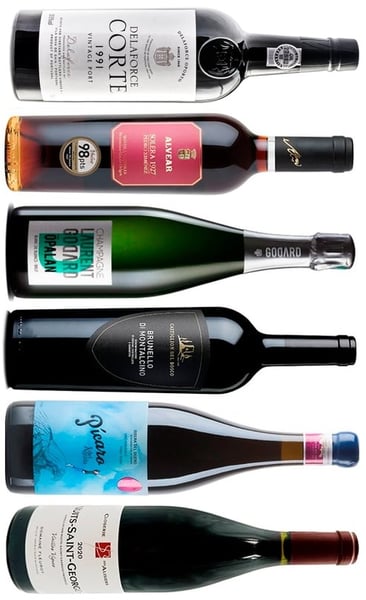 Vinlåda med 6 topprankade viner. Från 30+ år gammalt och sällsynt, topprankat portvin till PX med 98 poäng av Robert Parker. Stor Brunello, Ribera del Duero, Bourgogne och till sist Champagne.