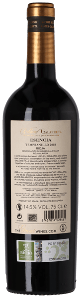 Esencia 2018 är gjord på 100 % Tempranillo, som skördas från fyra av de finaste och högst belägna parcellerna i staden Labastida (La Cabaña (1964), El Bosque (1975), Espribel och Marrate (1997)), som ligger mellan floden Ebro och bergskedjan Sierra de Toloño i Rioja Alavesa. Gemensamt för de fyra parcellerna är att de är nordvända, vilket säkrar en sval elegans i den annars mycket varma regionen. I genomsnitt är Tempranillo-stockarna 60 år gamla och alla parceller skördas separat beroende på när druvorna är perfekt mogna. När druvorna anländer till vineriet krossas de varsamt och Macerationen/utblötnandet av druvskalen i musten varar i fyra dagar för maximal extraktion av färg och smak. Därefter följer en noggrant kontrollerad jäsning under 28 °C. Vinet mognar i bästa Rioja-stil i 15 månader på en blandning av nya och gamla ekfat - varav 80 % franska och 20 % franska - som ger mycket krydda och komplexitet till den slutliga vinen. Efter fatlagringen buteljeras vinet, varefter det mognar minst 12-14 månader på flaska. Detta parti kommer direkt från Rolland & Galarretas egna källare, där toppvinet har mognat till perfektion i nästan 8 år.