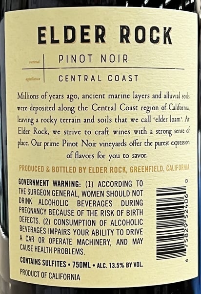 Elder Rock presenterar sig med en vibrerande frisk och ljus körsbärsröd färg. Doften andas elegant ”cool climate” Cali-Pinot med friska röda rosor, vilda hallon, saftiga skogssmultron och körsbär, som på ett vackert sätt omsluts av vanilj, cederträ och ljust rostade kaffebönor från mognadsprocessen på amerikansk och fransk ek. I munnen dansar den silkeslena Pinot Noir lätt och elegant över tungan med ett fantastiskt samspel mellan sval finess, kryddighet och solmogen fruktighet. Allt framstår mjukt och läckert i munnen med finkorniga tanniner som för vidare till en lång och lyxigt kryddig avslutning med choklad, vanilj, rök och nymalet kaffe. Det här är lyx-Pinot till spotpris. Stark rekommendation! Drick nu, eller spara 5–8 år från skördeåret.