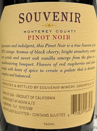 Souvenir presenterar sig med en mörk och intensiv Pinot Noir-färg. Nosen utstrålar kalifornisk charm-Pinot med solmogna jordgubbar, rabarber, hallon, körsbär och vaniljkryddade blåbär. Några virvlar i glaset frigör ytterligare komplexitet från fatet med inslag av kungen av Danmark och nymalda kaffebönor. I gommen, saftig och koncentrerad med mycket förförisk bärfrukt och silkeslena tanniner. Lång och lyxigt fatkryddad avslutning som gör nästa tugga oundviklig. Souvenir levererar återigen ett sensationellt Pinot Noir-värde. Drick nu eller spara 6-8 år från skördeåret.