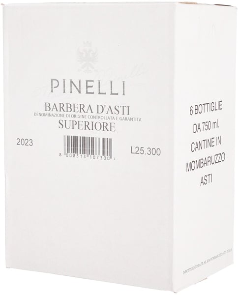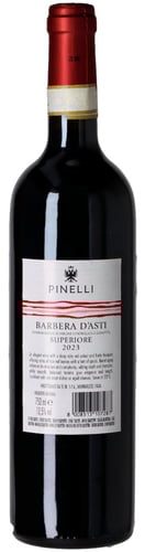 Pinelli Barbera d'Asti Superiore DOCG 2023 står mörkt björnbärsröd i glaset… Doften avslöjar en Barbera i absolut toppform – full av liv och energi, där den friska bärfrukten nästan dansar ur glaset. Svarta, saftiga körsbär, mogna plommon, viol, hallon och björnbär ackompanjeras av inslag av lakrits och örtkryddor, medan diskreta fattoner av kaffe, vanilj och choklad tillför både djup och komplexitet… Smaken följer vackert upp med saftig och livlig frukt från första klunken. Fina örttoner, silkeslena tanniner och en perfekt balanserad kryddning från ekfaten lyfter avslutningen till toppnivå. Essensen av piemontesisk, matvänlig Barbera. Drick nu, eller lagra 5–7 år från skörden.