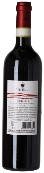 Pinelli Barolo 2021 framträder elegant körsbärsröd med en mogen tegelnyans vid glasets kant… Doften är intensiv och komplex med nyanser av torkade rosor, mörka körsbär, tranbär, lakrits, kamfer och kryddor. Allt ramas elegant in av mineraliska toner av skogsbotten, en antydan av tjära samt subtila kaffenoter från den 36 månader långa fatlagringen... I munnen torr och fyllig med förföriska bäraromer och en markant, karaktärsfull textur. Den mogna frukten spelar vackert tillsammans med fasta, matvänliga tanniner, en frisk mineralitet och ett örtkryddigt djup. En välavvägd och klassisk Barolo av utmärkt kvalitet. Drick nu, eller lagra i minst 15 år från skördeåret.