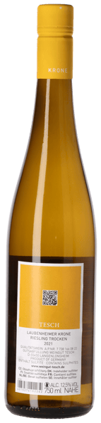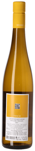 Martin Teschs "Krone" lyser i glaset med en halmgul färg och rena limegröna reflexer. Mein Gott, vilken doft... Vinet hoppar upp ur glaset med vita blommor, mogna äpplen, grapefrukt, citron, torkad aprikos och mineraltoner av våta stenar! Vinet landar torrt och medelfylligt i munnen med mogen frukt och mineralisk friskhet i sublimt samspel. I den långa eftersmaken får citrusfrukten sällskap av en härlig, flintskalig mineralitet och lite komplexa rostade toner. Den friska och munrengörande eftersmaken visar på stor gastronomisk potential. Martin Tesch har gjort det igen! Drick nu eller spara 15-20 år från skördeåret.