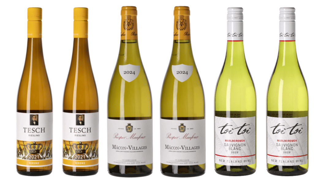 Dr. Martin Tesch från Nahe med sin hederkronede enkeltmarks‑Riesling, Bourgogne‑klassikern Prosper Maufoux med sin oemotståndliga Mâcon‑Villages Chardonnay och överväldigande charm från Nya Zeeland, Toi Toi med sin Marlborough Sauvignon Blanc.
