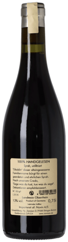 Ziereisen Jaspis Däublin Syrah står björnbärslila i glaset med små violetta inslag vid kanten... Redan doften är djupt fängslande och träffar sinnesapparaten med intensiva aromer av viol, blåbär, svarta vinbär, vilda hallon, kalkstensmineralitet och skogsbär, som på bästa Côte‑Rôtie‑manér tillförs komplexa toner av krossade pepparkorn, rökt kött, vanilj och torkade kryddörter... I munnen är vinet överväldigande intensivt med en sval och saftig Syrah-frukt i förgrunden. Under den mörka bärsmaken döljer sig en gåtfull mineralitet och sötmafyllda fatkryddor som fortsätter in i den oändliga finishen. Zensationell Ziereisen. Drick nu, eller lagra 15–20 år från skördeåret.