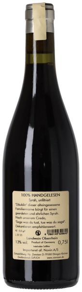 Däublin från toppserien ”Jaspis” består av 100 % Syrah, som Hanspeter plockar för hand från små parceller på det branta, sydvända kalkstens-terroiret Efringer Oelberg i Sydbaden.