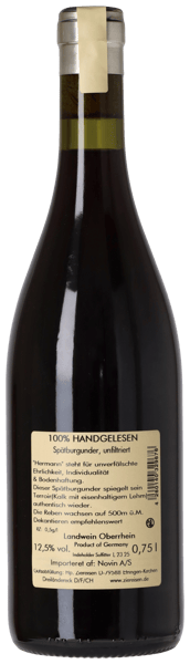 Jaspis Hermann är framställd på 100% Spätburgunder (Pinot Noir), som handskördas från en särskild parcell med över 50 år gamla vinstockar på den 1,5 hektar stora, kedelformade terroiren Talrain, som ligger omgiven av skog 500 meter upp i Schwarzwald. Här uppe är jordmånen 'burgundisk' rostfärgad med sin eftertraktade blandning av järnoxid och kalksten. Terroirvinet spontanjäser på franska fat från vännen Pierre Gonon med cirka 4 veckors skalkontakt. Resultatet är ett rödvin med unik, sval, mineralisk karaktär, som fulländas med kryddig komplexitet efter cirka 20 månader på tysktillverkade Assmann-barriquefat i kontakt med de fina jästresterna.