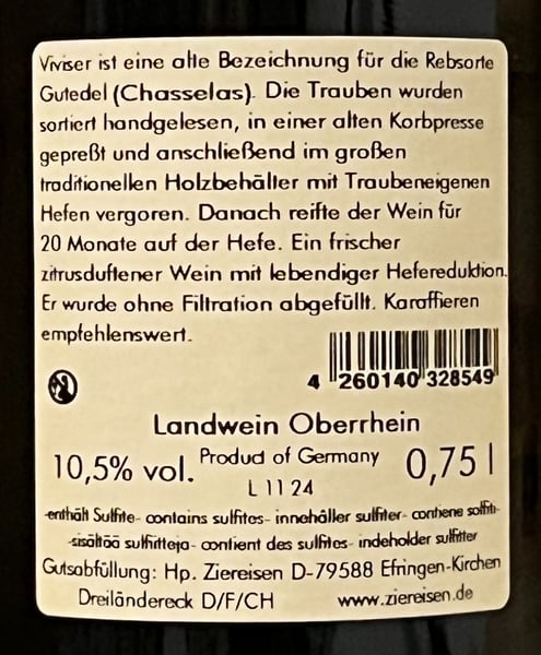 Viviser 2020 är gjord av 100% Gutedel (Chasselas), som Weingut Ziereisen skördar för hand på toppen av den upp till 50% branta och kalkrika Efringer Oelberg-jordmånen i södra Baden. Druvorna pressas vid relativt högt tryck, 6 bar, för att extrahera karaktär och personlighet från musten, som sedan spontanjäses med terroirens naturligt förekommande jäststammar. Vinet mognar i nästan 2 år på 3000 liters tyska Assmann ekfat i kontakt med den fina jästfällningen, vilket ger det friska vita vinet en elegant textur och en Champagne-liknande komplexitet. Tappas på flaska utan klarning och filtrering - och med minimal tillsats av sulfiter.
