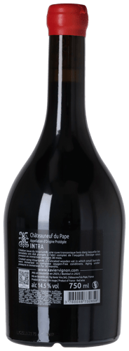 Xavier Châteauneuf-du-Pape Intra Rouge er fremstillet på 60 % Grenache, 10 % Syrah samt et uspecificeret field blend fra over 60 år gamle vinstokke. Denne fremstillingsmetode læner sig op ad gamle traditioner, hvor field blends var helt almindelige, og den giver vinen både klassisk Châteauneuf-du-Pape-karakter og ekstra kompleksitet. Vinen gennemgår en usædvanligt lang gæring på hele 6–8 måneder, hvilket bidrager til dybde, struktur og aromatisk intensitet. Efter endt gæring lagres vinen i det højt nytænkende Vinarium – en moderne lagringsmetode, der er udviklet med fokus på optimal modning og maksimal bevarelse af vinens naturlige udtryk – læs mere om metoden i den uddybende beskrivelse.
