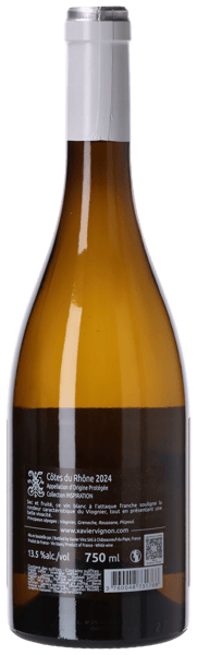 Vinet är gjort på en klassisk aromatisk Rhône-blend av 40% Viognier, 30% Grenache Blanc och 20% Roussanne, som i den duggfriska årgången 2024 får ett perfekt munrensande pift med 10% av den ultrafräscha druvsorten Picpoul. Druvorna till Xaviers vita vin skördas från mycket gamla vinstockar, varav de äldsta är mer än 100 år gamla. Ju äldre vinstockarna blir, desto färre druvor producerar de. Däremot är smakintensiteten i topp! Jordmånen på vinodlingarna i norra Vaucluse består huvudsakligen av lera och kalksten, vilket ger både friskhet och syra åt det fylliga vita vinet. I vineriet jäser varje druvsort för sig, så att de unika aromerna bevaras. Efter avstjälkningen kallmacererar man druvorna för att överföra druvskinnets läckra fruktaromer till musten. Roussanne jäser och mognar på medelstora ekfat, medan de övriga druvsorterna vinifieras med temperaturstyrning i ståltankar.