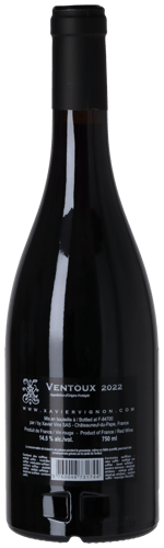 Xavier Ventoux är gjord på en utsökt blandning av 60 % Grenache, 30 % Syrah och 10 % Mourvèdre, varav både Grenache och Mourvèdre kommer från upp till 100 år gamla vinstockar. Druvorna plockas från omkring 60 små parceller 250–400 meter över havet. Dels från sluttningarna nedanför det legendariska ”skaldede bjerg” Mount Ventoux, dels från högre liggande terrasser i det kalkstensrika Dentelles de Montmirail. För att skapa en unik och komplex smakupplevelse låter Xavier Vignon druvsorterna jäsa tillsammans. Vinet mognar mestadels fruktbevarande i betongtankar, medan 5 % får extra kryddigt djup genom lagring på små franska ekfat i 12 månader.