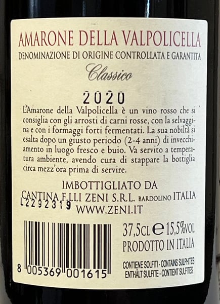Zeni Amarone della Valpolicella Classico 2020 - Halvflaske 37,5 cl.